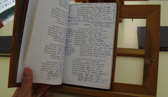 "Reading between Two" is a book read simultaneously by two people. These people are distant from each other (in two different countries). They are a couple of a male and a female, each of whom has a copy of the same book of poems. The book in this case has become a place of appointment, the reading of the couple coincided in time and text (a poem by night, at the same time). What is shown is one of the two books that contains a translation from the original Portuguese to the Spanish language, written by hand in the page’s margins. All the dates and places of reading are recorded in the book.